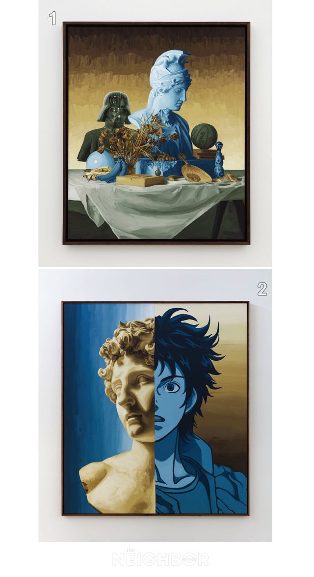 ‘상상의 고고학’ 작업 전반에서 다가오는 감정은 이 같은 향수다. 예컨대 그가 지난 1년간 집중한 ‘분절된 아이돌’ 시리즈는 화면을 절반으로 나눠 고대 석고상과 현대 애니메이션 화풍의 인물을 병치했다. 과거와 현재의 문화적 도상이 시대를 넘어 연결되는 작품은 실제로 경험한 적 없는 수 세기 전과 유년 시절을 향한 그리움을 동시에 유발한다.