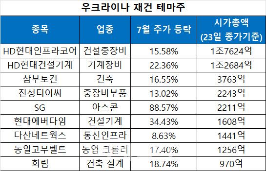 김대준 한국투자증권 연구원은 “트럼프 전 대통령의 대선 승리 기대 속 우크라이나 재건 테마가 빠르게 부상하고 있다”며 “우크라이나 재건은 미국과 유럽을 중심으로 진행될 가능성이 크나 한국 정부와 기업의 역할도 기대해 볼 수 있다”고 말했다.