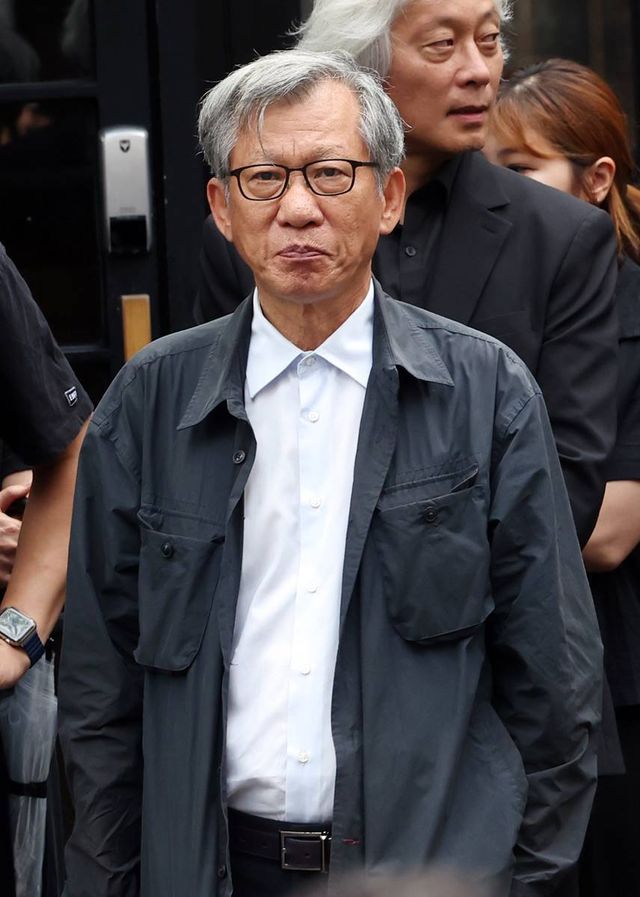 24일 서울 종로구 대학로 아르코 꿈밭극장(옛 학전)에서 열린 고 김민기의 노제에서 유홍준 전 문화재청장이 고인의 마지막 길을 지켜보고 있다 / 뉴스1