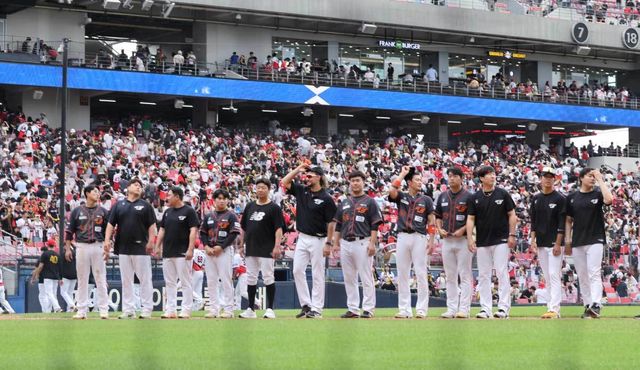 팬들에게 인사하는 한화 선수들. 지난 6월 23일 오후 광주 기아챔피언스필드에서 열린 '2024 신한 SOL 뱅크 KBO리그' 한화 이글스와 KIA타이거즈 더블헤더 1차전은 한화가 9대8로 승리를 거두며 선수들이 인사를 나누고 있다. / 뉴스1