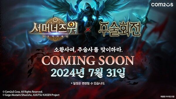 이와 관련해 오는 7월 31일 ‘서머너즈 워’와 인기 애니메이션 ‘주술회전’의 협업을 예고하는 티저 영상이 공개됐다.
