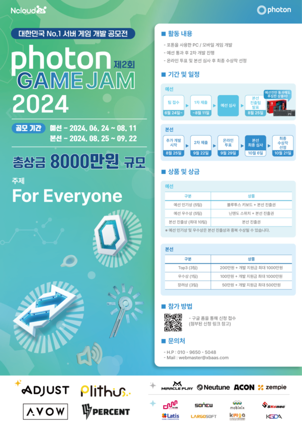 아울러 이번 포톤 게임잼은 작년과 다르게 예선에서 참가자들에게 총 400 만 원 상당의 경품이 제공되며, 본선 진출자들은 약 8, 000 만 원 상당의 상금 및 개발 지원금이 제공될 예정이다.