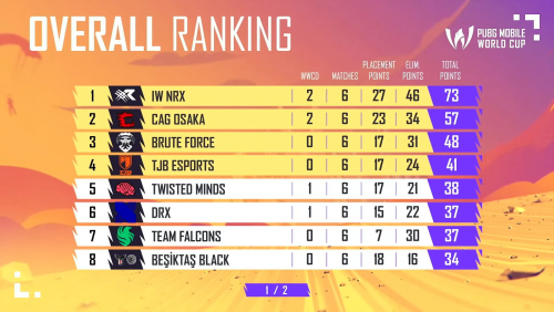 1매치에서 DRX는 베식타스 e스포츠 블랙를 상대로 킬 포인트를 빠르게 챙기며 각성했다. 이후 DRX는 TOP4에 들어가며 끝까지 공격적인 움직임을 보였지만 잇따른 교전으로 인원 손실을 입고 후일을 도모했다. 첫 매치에서 DRX는 4위로 기분 좋은 출발을 했고, 디플러스 기아는 2킬 포인트를 획득하며 10위에 올랐다.