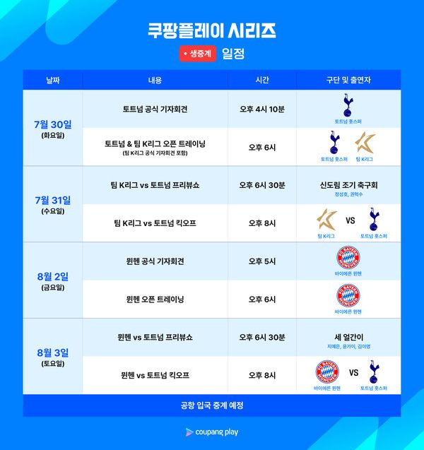 쿠팡플레이 시리즈의 중계는 세계적인 선수들의 대한민국 입국 현장부터 시작한다. 토트넘 주장 손흥민을 포함해 제임스 매디슨, 데얀 쿨루세프스키 등 프리시즌에서 좋은 기량을 펼치고 있는 선수들의 입국 장면을 실시간으로 전한다. 이후 바이에른의 ‘괴물 수비수’ 김민재를 비롯해 토마스 뮐러, 주앙 팔리냐 등 선수들의 입국 장면도 담을 예정이다.