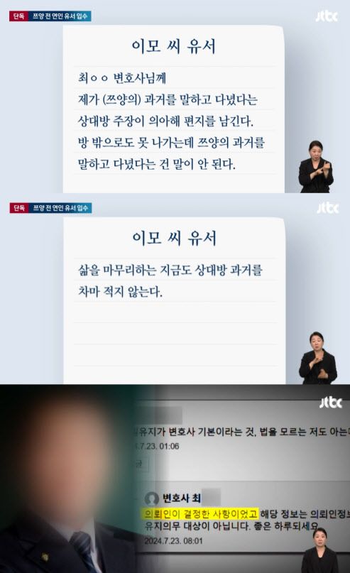24일 JTBC에 따르면 A씨는 지난해 4월 극단적 선택으로 사망 전 가족에게 남긴 유서와 별개로 자신의 법률대리인이었던 최모 변호사에게도 유서를 남겨 자신의 억울함을 호소했다.
