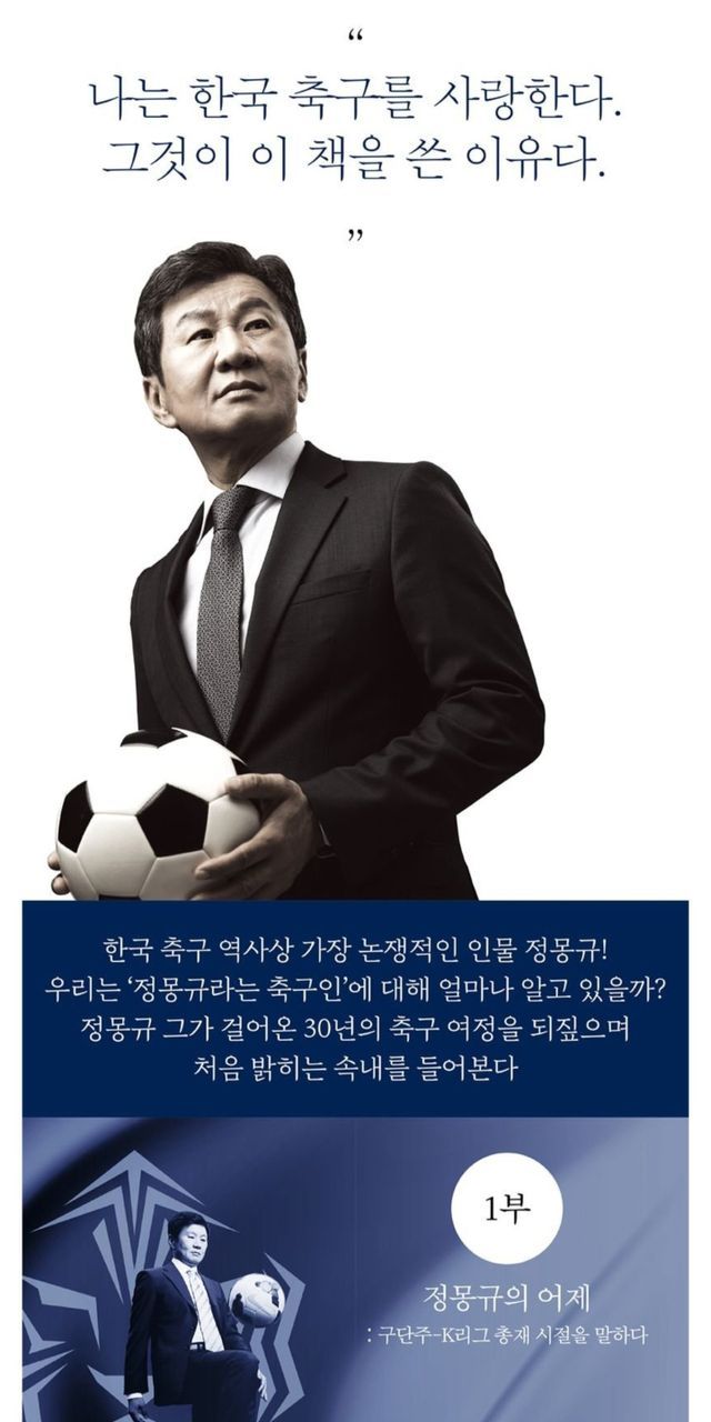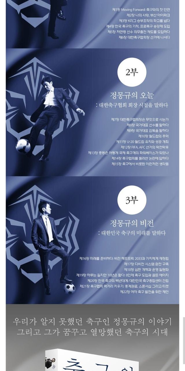 1부 - 정몽규의 어제: 구단주-K리그 총재 시절을 말하다 제1장 - Moving Forward: 축구와의 첫 인연 제2장 - 나의 사랑, 부산 아이파크 3장 - K리그 승부조작의 파고를 넘다 제4장 - 한국 축구의 기적, 프로축구 승강제 도입 제5장 - 저연령 선수 의무출전 제도를 도입하다 제6장 - 대한축구협회장 선거에 나서다 2부 - 정몽규의 오늘: 대한축구협회 회장 시절을 말하다 제7장 - 대한축구협회장은 무엇으로 사는가 제8장 - 국가대표 선수를 말하다 제9장 - 국가대표 감독을 말하다 제10장 - 월드컵의 추억 제11장 - U-20 월드컵 유치와 성공 개최 제12장 - FIFA, AFC 선거의 막전막후 제13장 - 중동은 어떻게 국제 축구계의 파워베이스가 되었나 제14장 - 축구협회를 둘러싼 논란에 답하다 제15장 - 축구에서 비롯된 이런저런 생각들 3부 - 정몽규의 비전: 대한민국 축구의 미래를 말하다 제16장 - 미래를 준비하다: 비전 해트트릭 2033과 가치체계 재정립 제17장 - 디비전 시스템 완전 구축 제18장 - 심판 개혁과 운영 일원화 제19장 - 하루는 길지만 10년은 짧다: 8인제 축구 도입과 골든 에이지 제20장 - 한국 축구의 백년대계: 대한민국 축구종합센터 건립 제21장 - 축구협회 먹거리 키우기: 중계권료, 스폰서십 그리고 티켓 제22장 여자 축구 발전을 위한 제언 에필로그: 그래도 못다 한 이야기들 |