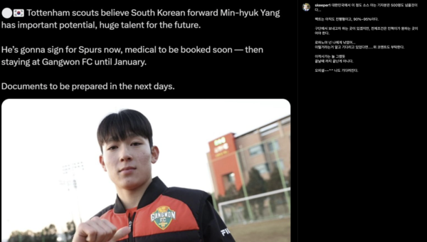 앞서 유럽축구 이적시장 사정에 밝은 파브리치오 로마노 기자는 “토트넘이 2006년생 강원 윙어 양민혁 영입을 앞두고 있다. 합의가 다 끝났고 메디컬 테스트만 남았다”며 “토트넘 스카우터는 양민혁이 중요한 잠재력을 갖고 있다고 믿는다”며 토트넘이 양민혁 영입에 진심이라고 전했다.