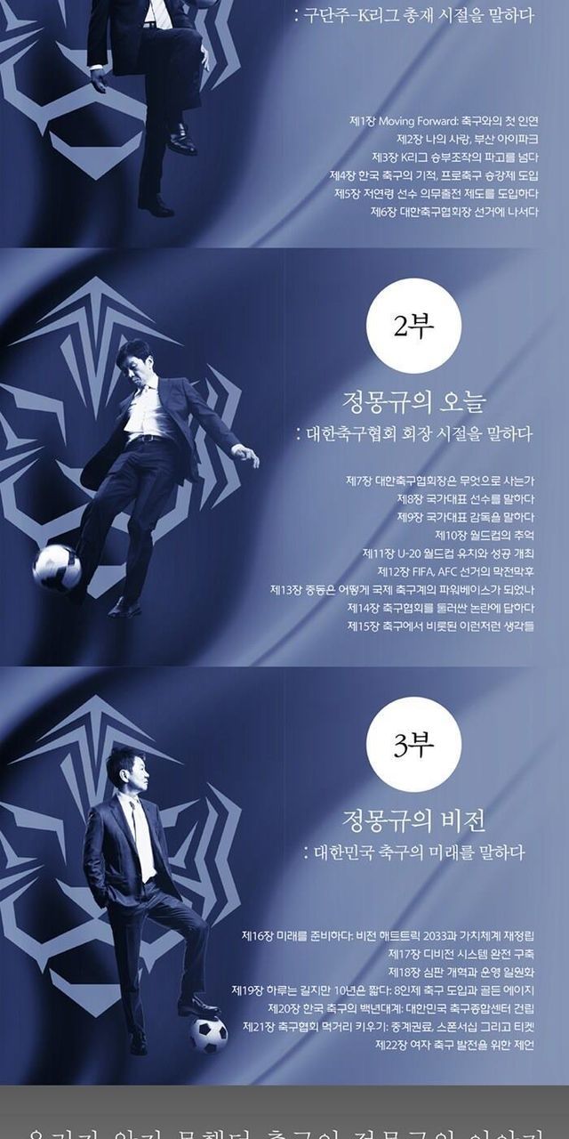 그러면서 "정몽규 그가 걸어온 30년의 축구 여정을 되짚으며 처음 밝히는 속내를 들어본다. 정몽규라는 기업인이 30년간 한국 축구의 발전을 위해 생각하고 고민했던, 도전하고 시도했던 일들이 고스란히 담겨 있는 책이다"라고 설명했다.