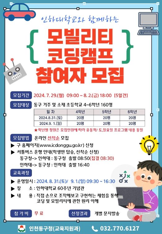 [파이낸셜경제=김영란 기자] 인천 동구는 8월 31일 부터 9월 1일 인하대학교와 함께하는 ‘모빌리티 창의융합 코딩캠프’를 개최한다고 밝혔다.