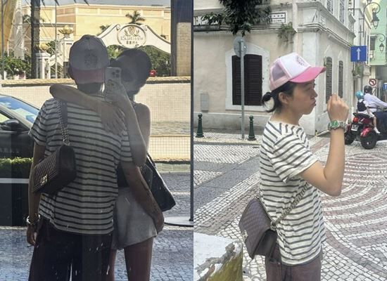 릴러말즈는 줄무늬 티셔츠에 핑크색 모자와 갈색 가죽 가방을 매치했다. 전은비와 포옹하고 있는 남성도 같은 아이템을 착용한 모습이다.