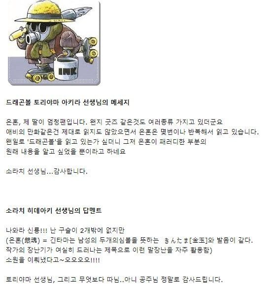 딸이 좋아하는 만화인 은혼에서 드볼을 여러번 패러디한걸 계기로 처음으로 자기 만화에 관심을 가지게 해줬다고