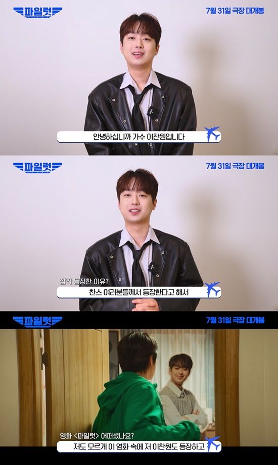 호탕한 인사와 함께 등장한 이찬원은 "영화 '파일럿'에 제가 사랑하는 찬스(팬덤명) 여러분이 등장한다고 해서 찾아왔다. 영화 속에 저도 등장해서, 영화를 더욱 재미있고 몰입감 있게 볼 수 있었다"고 전해 영화 속에 깜짝 등장하는 본인은 물론 팬클럽 찬스까지 함께 언급하며 반가운 마음을 드러냈다.