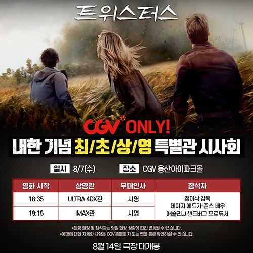 내한을 기념한 CGV 특별관에서의 최초 시사회에 더해 두 차례의 무대인사까지 준비되어 있어 국내 팬들을 설레게 하고 있다. '트위스터스' 팀을 만날 수 있는 시사회와 무대인사에 대한 자세한 내용은 추후 CGV 홈페이지와 앱을 통해 확인할 수 있다.