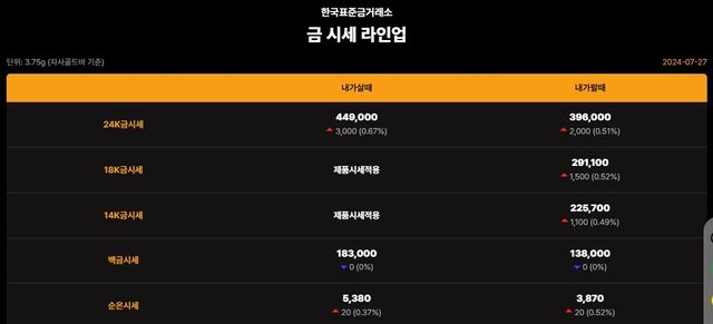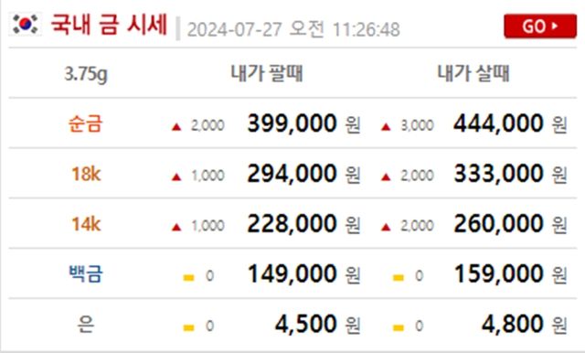 순금(24K) : 매입가 44만 4000원 / 매도가 39만 9000원