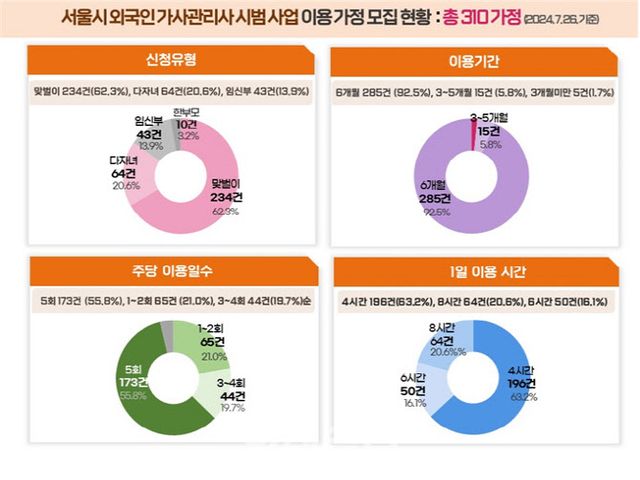 김선순 서울시 여성가족실장은 “서울시 외국인 가사관리사 시범사업 이용가정 모집에 많은 시민들이 참여해 주신 것을 통해 자녀돌봄 서비스를 필요로 하는 가정이 많다는 것을 확인할 수 있었다”며 “특히 36개월 미만 자녀를 둔 가정이 많다 보니 돌봄 위주 요청이 많았고 자녀와 영어 대화를 원하는 가정이 많았다”고 말했다. 이어 “선착순이 아니라 다양한 조건을 고려해 이용 가정을 최종 선정할 예정”이라며 “이번 시범사업에 참여를 원하는 가정에서는 기간 내에 꼭 신청해 주시길 바란다”고 말했다.