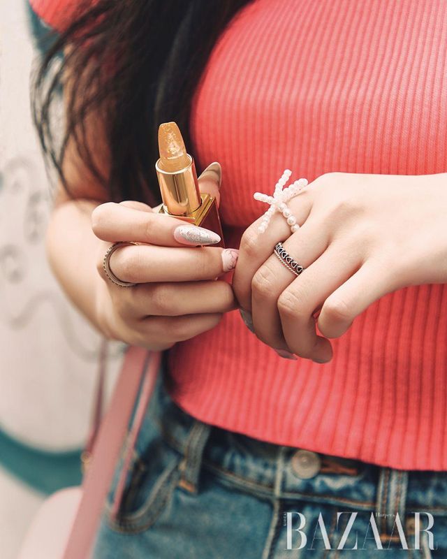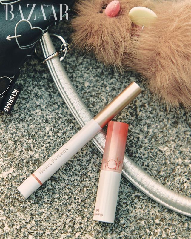 “입술을 강조하는 방법! 하트퍼센트 ‘도트 온 무드 립펜슬’로 입술 라인을 넓히고 롬앤 ‘글래스팅 멜팅 밤’ 06 카야 피그로 반짝이는 장밋빛 입술을 완성했죠.” 민지연(20)