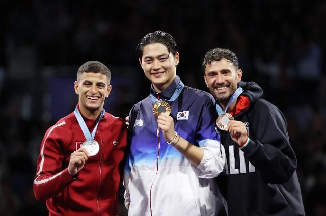 韩国选手吴尚旭(中)在男子佩剑决赛中获得金牌。【图片提供 韩联社】