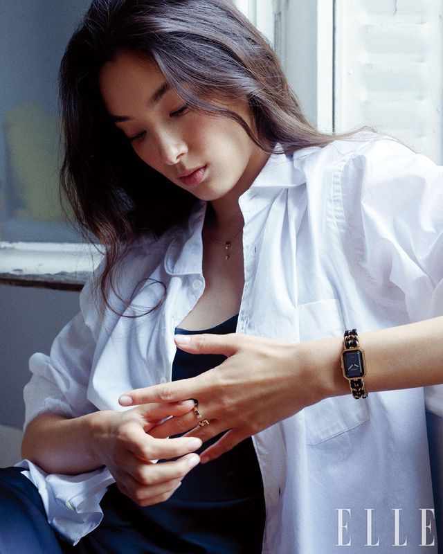 왼손에 착용한 프리미에르 오리지널 에디션 워치와 다이아몬드 세팅 코코 참을 더한 프리미에르 루반 꾸뛰르 워치, 화이트골드 이터널 N°5 링, 오른손에 착용한 베이지골드 엑스트레 드 N°5 링, 다이아몬드 이터널 N°5 싱글 이어링은 모두
