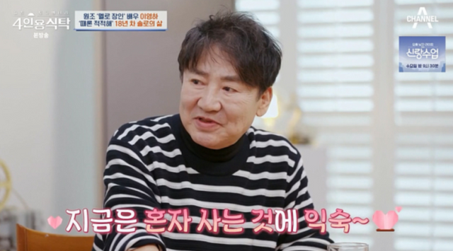 이영하는 재혼에 대한 솔직한 생각을 밝혀 시선을 모으기도 했다. 노현희가 "혼자 살면 불편하지 않느냐. 끝까지 혼자 사실 거냐"라고 질문하자 그는 "재혼 생각은 한 번도 해본 적이 없다. 지금 혼자 사는 생활이 너무 편하고 좋다."라고 대답했다.