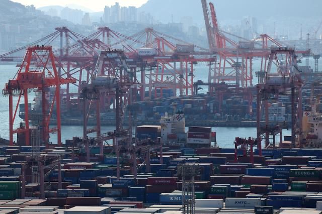 位于釜山南区的神仙台码头上,堆满了等待出口的集装箱。【图片提供 韩联社】