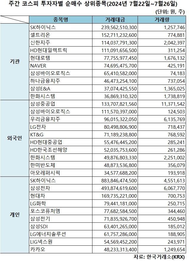 기관 'SK하이닉스'·외인 '삼성중공업'·개인 'SK하이닉스' 1위 [주간 코스피 순매수- 7월22일~7월26일]
