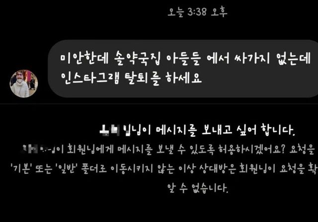 공개된 메시지에는 “미안한데 ‘솔약국집 아들들’에서 싸가지 없는데 인스타그램 탈퇴를 하세요”라는 내용이 담겼다.