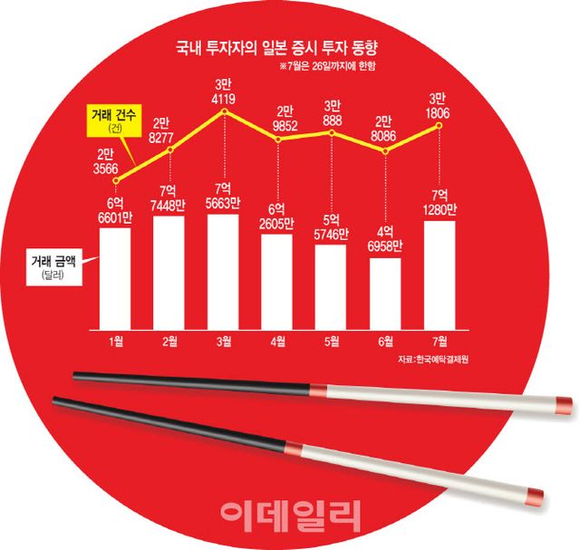 28일 한국 예탁결제원에 따르면 이달 일학개미(일본 증시 투자자)의 매수와 매도를 더한 거래건수는 3만 1806건으로 6월에 비해 13.25% 늘었다. 거래금액의 경우 매수는 지난 6월 4억 6958만달러에서 7억 1280만달러로 증가했고, 매도액은 6506억원에서 9875억원으로 늘어난 것으로 집계됐다.