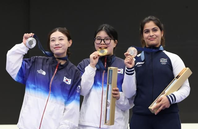 韩国选手吴艺真(中)和金艺智(左)摘得射击女子10米气手枪金银牌。【图片提供 韩联社】