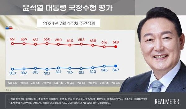 여론조사 전문회사 리얼미터가 에너지경제신문 의뢰로 지난 22~26일 전국 18세 이상 유권자 2508명에게 윤 대통령 국정 수행 평가를 물은 결과 긍정 34.7%, 부정 61.8%였다. 잘 모른다는 응답은 3.5%였다.
