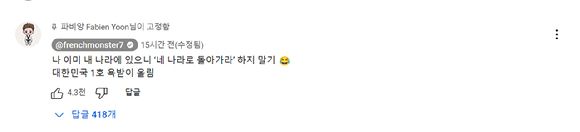 파비앙은 이와 함께 고정 댓글로 "난 이미 내 나라에 있으니 '네 나라로 돌아가라' 하지 말기. 대한민국 1호 욕받이 올림"이라고 적기도 했다.