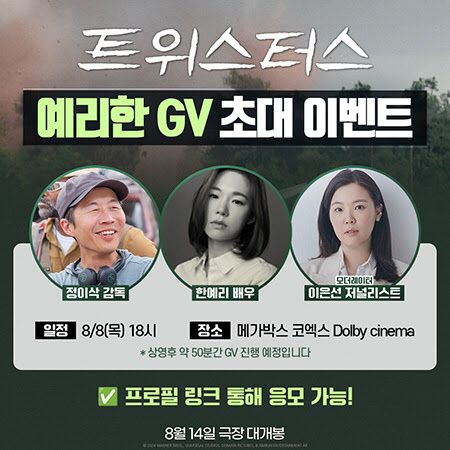 정이삭 감독, 한예리, 이은선 저널리스트가 함께하는 ‘예리한 GV’ 진행을 확정한 영화 ‘트위스터스’는 8월 14일 극장에서 개봉 예정이다.