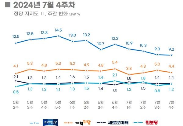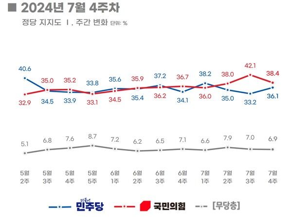 정당 지지율은 국민의힘 38.4%(3.7%P↓), 더불어민주당 36.1%(2.9%P↑), 조국혁신당 9.2%(0.1%P↓), 개혁신당 4.4%(0.6%P↓)로 나타났다. 국민의힘 전당대회가 23일 마무리되고 민주당 전당대회는 시작하면서 양당 격차는 다시 줄어들었다.