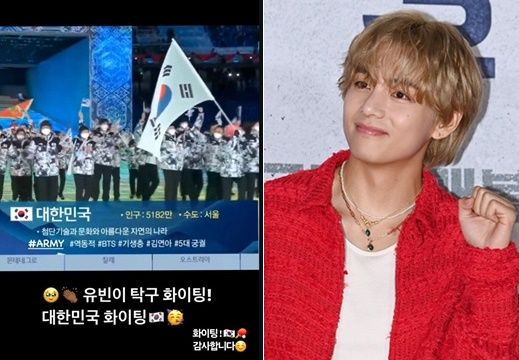 먼저 뷔는 올림픽 개막식 한 장면과 함께 "대한민국 화이팅"이라는 응원 메시지를 남겼다. 특히 방탄소년단 팬으로 알려진 신유빈의 이름과 함께 "유빈이 탁구 화이팅"이라는 다정한 메시지까지 더해 관심을 집중시켰다.