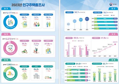 29일 통계청이 발표한 ‘2023년 인구주택총조사 결과(등록센서스 방식)’를 보면 작년 11월 1일 기준 총인구는 5177만 5000명으로 전년보다 8만 2000명(0.2%) 늘었다.