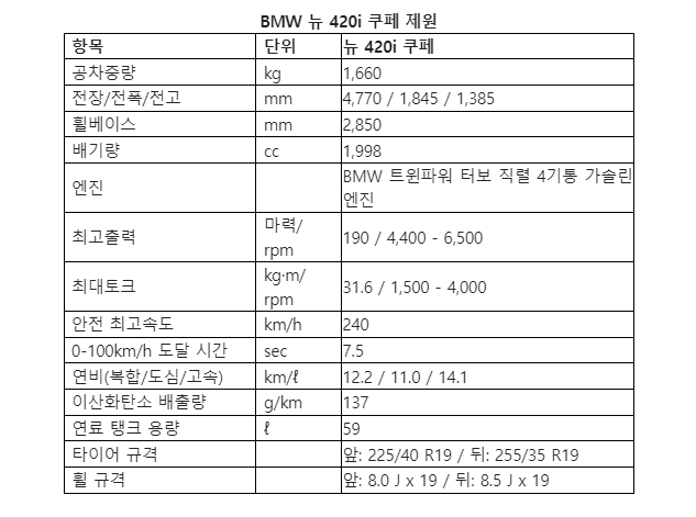 뉴 420i 쿠페 및 컨버터블은 최고출력 190마력, 최대토크 31.6kg·m을 발휘하는 BMW 트윈 파워 터보 4기통 가솔린 엔진을 탑재하며, 8단 스텝트로닉 자동변속기를 조합했다. 정지 상태에서 시속 100km까지 가속하는 데 걸리는 시간은 뉴 420i 쿠페가 7.5초, 뉴 420i 컨버터블이 8.2초다.