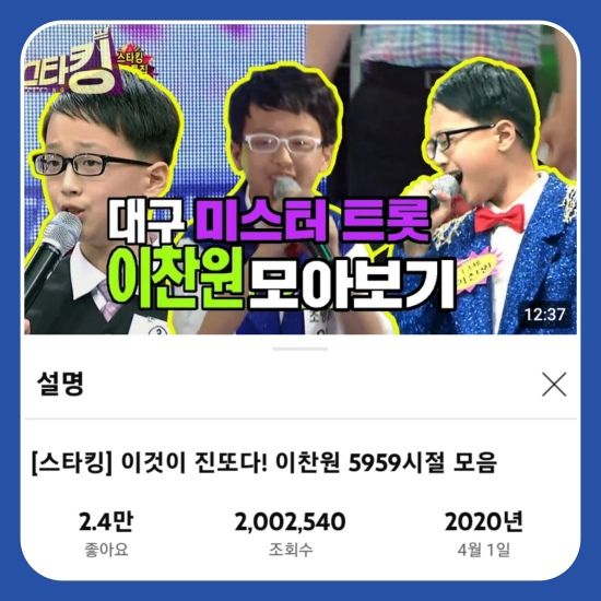 이 영상은 이찬원이 어린 시절 출연한 '스타킹' 95회, 97회 방송이 담겨있다. 본인을 씩씩하게 소개하는 초등학생 이찬원. 어린 시절부터 타고난 끼로 방청객과 패널들의 호응을 유도하는 장면은 현재그의 모습을 떠올리게 만든다.
