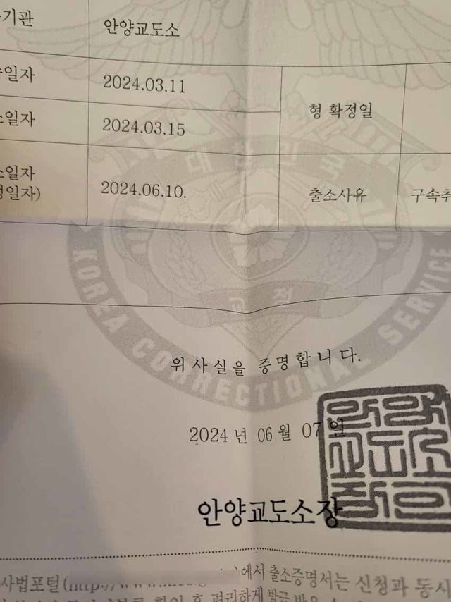 안양교도소장이 발급한 출소 증명서. / 디시인사이드