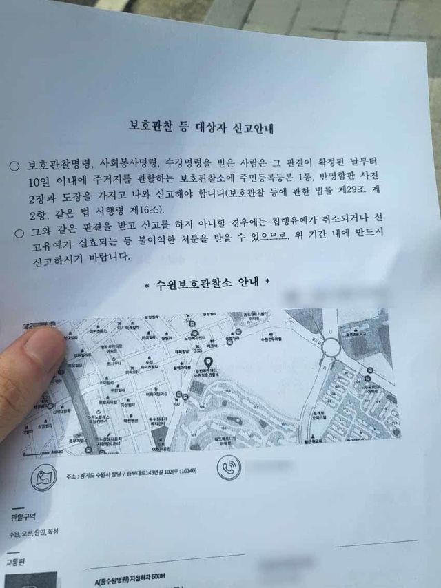 글쓴이 A 씨는 “이젠 전 여친 동네 근처에 가지도 못하게 보호관찰 지정돼 몇 시간에 한 번씩 지금 어디 있는지 보고해야 한다. 범죄자 되는 거 진짜 순식간이다”란 글과 함께 안양교도소장이 발급한 출소 증명서, 수원보호관찰소가 A 씨에게 발송한 안내문을 담은 사진을 게재했다.