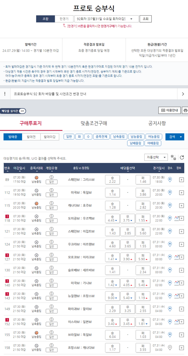 ‘2024 파리 올림픽’ 경기 중 프로토 승부식 92회차 상품에 포함된 대상 경기는 축구 7경기, 배구 4경기, 농구 3경기 등 총 14경기이며, 각 대상 경기별 일반, 핸디캡, 언더오버 등 다양한 유형의 47가지 게임이 스포츠팬들을 찾아간다.