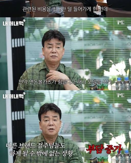 그는 "광고를 해서 억지로 할 수 없다. 다른 데는 광고 모델 쓰고 본사에서 낸다지만 결국 점주님들 걷어야 한다. 이럴 시간에 방송 말고 매장에 신경 쓰라고 하는데 진짜 상처를 어마어마하게 받는거다"라며 "나름대로 방송을 나가고 인지도 올려서 모델 쓸 거 있으면 안써도 되게하고 비용을 최대한 덜 들어가게 한건데 , 만약 연돈볼카츠가 힘들다고 해서 모델을 쓰면 다른 점주님들은 어떻게 해야하는거냐"라고 말했다.