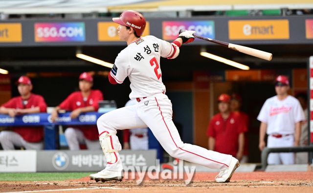 2024년 7월 30일 인천 SSG랜더스필드에서 '2024 신한 SOL Bank KBO리그, 롯데 자이언츠와 SSG 랜더스의 경기가 열렸다. SSG 박성한이 2회말 2사 1.2루서 1타점 적시타를 치고 있다./인천 = 유진형 기자 zolong@mydaily.co.kr
