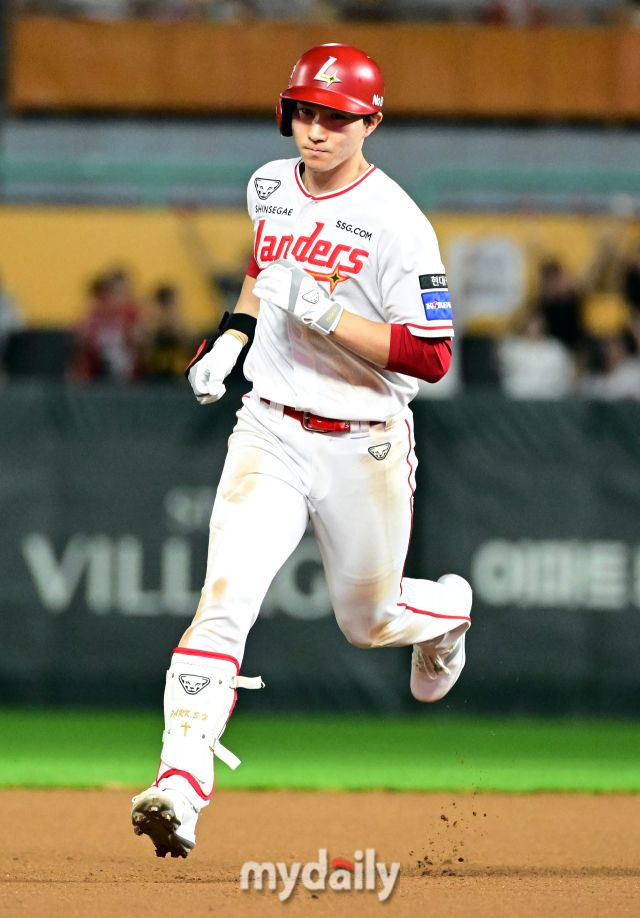 2024년 7월 30일 인천 SSG랜더스필드에서 '2024 신한 SOL Bank KBO리그, 롯데 자이언츠와 SSG 랜더스의 경기가 열렸다. SSG 박성한이 6회말 선두타자 홈런을 친 뒤 그라운드를 돌고 있다./인천 = 유진형 기자 zolong@mydaily.co.kr