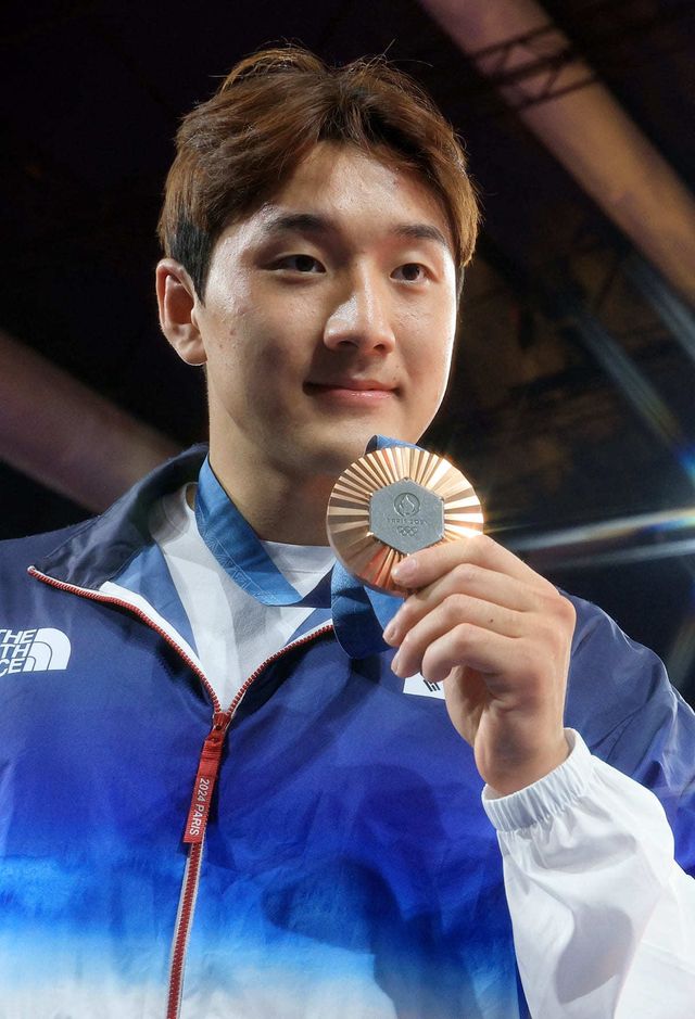 대한민국 유도대표팀 이준환 선수가 31일(한국시간) 프랑스 파리 샹 드 마르스 아레나에서 열린 2024 파리올림픽 유도 남자 -81kg 시상식을 마친 뒤 동메달을 들어 보이고 있다. / 뉴스1