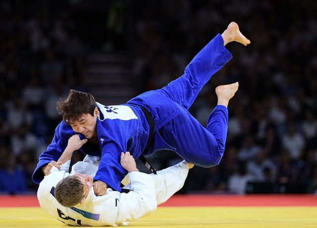 대한민국 유도대표팀 이준환 선수가 31일(한국시간) 프랑스 파리 샹 드 마르스 아레나에서 열린 2024 파리올림픽 유도 남자 -81kg 동메달 결정전에서 벨기에의 마티아스 카스 선수와 자웅을 겨루고 있다. / 뉴스1
