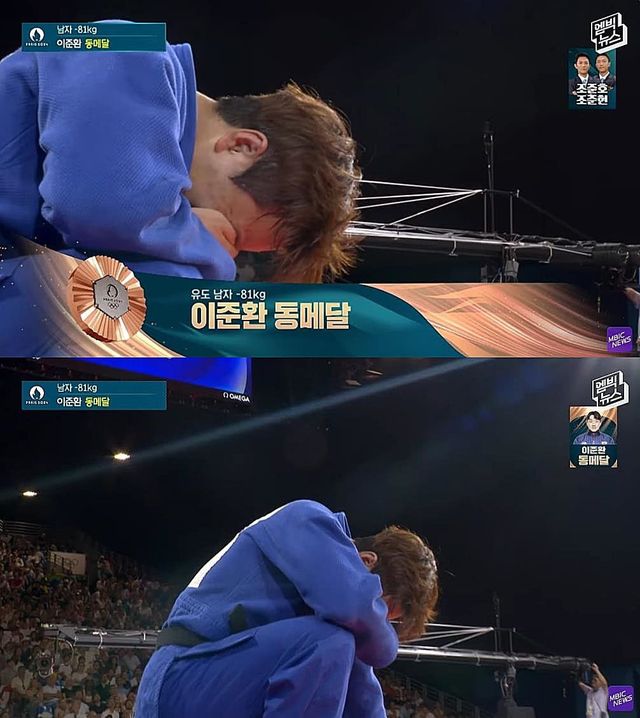 31일 동메달결정전에서 해당 체급 세계 랭킹 1위인 카티아스 카세를 꺾고 승리한 뒤 오열하는 이준환 / MBC 파리올림픽 중계 화면