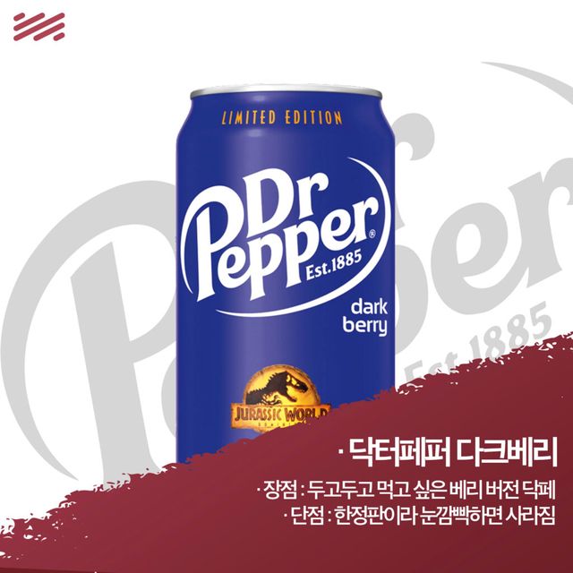 문제가 있다면 한정판이라는 것. 더 문제가 있다면 주로 출시되는 시기가 영화와 맞물린다는 점이다. 스파이더맨, 쥬라기 공원… 이 녀석들의 속편은 나와야 닥터페퍼 다크베리가 나올 텐데. 이 음료에 맛을 들여버리면 닥터페퍼를 위해 영화를 기다려야 하는 처지를 한탄할 수 있다.