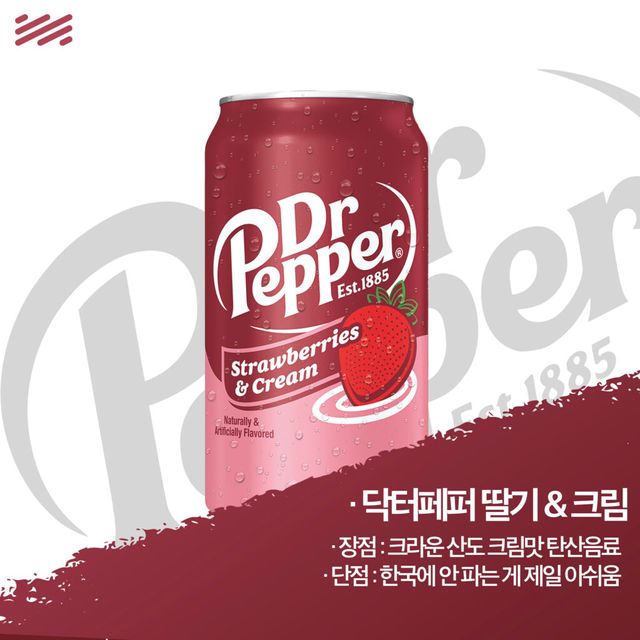 닥터페퍼 스트로베리 & 크림은 미국은 물론이고, 한국 사람도 좋아할 만한 요소를 많이 가졌다. 체리 뉘앙스가 강한 닥터페퍼의 중심이 ‘딸기’를 가지고 재편되었다. 게다가 부드러운 크림소다의 요소를 가지고 있어서 가벼운 탄산음료를 마시는데도 딸기우유 사탕을 마시는 듯 친숙한 맛이 난다. 마치 크라운산도랄까?