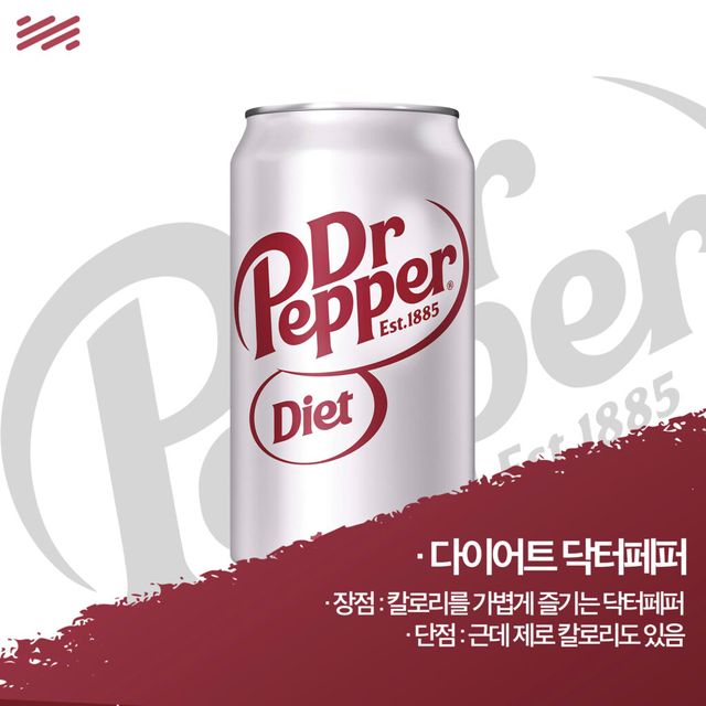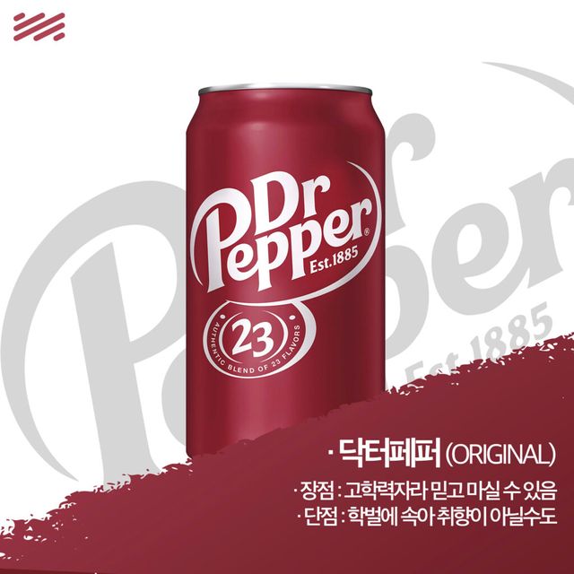 이름만 봐서는 ‘닥터페퍼는 원래 체리맛 아니야?’ 싶을 것이다. 하지만 닥터페퍼 매니아들에게 주의해야 할 2가지 말이 있다면. 그중 하나가 ‘닥터페퍼는 체리맛 아니야?’다. 닥터페퍼는 체리를 포함한 23가지 재료의 향이 섞인 복합적인 음료니까. 그걸 의식하듯 나온 것이 각을 잡고 나온 체리맛 ‘닥터페퍼 체리’다.
