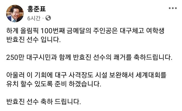 이런 가운데 홍준표 시장은 반효진의 금메달이 나온 뒤 30일 페이스북에 글을 올렸다.