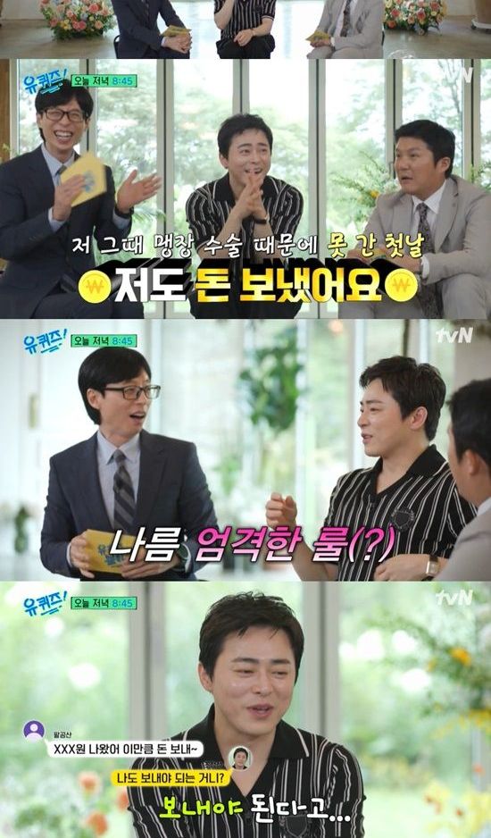 조정석은 "'우리 이렇게 나왔다. 돈 보내'라고 왔길래 나도 보내야 하냐고 물었다. 보내야 한다더라"며 불참석한 모임에도 돈을 걷는다고 덧붙여 웃음을 자아냈다.
